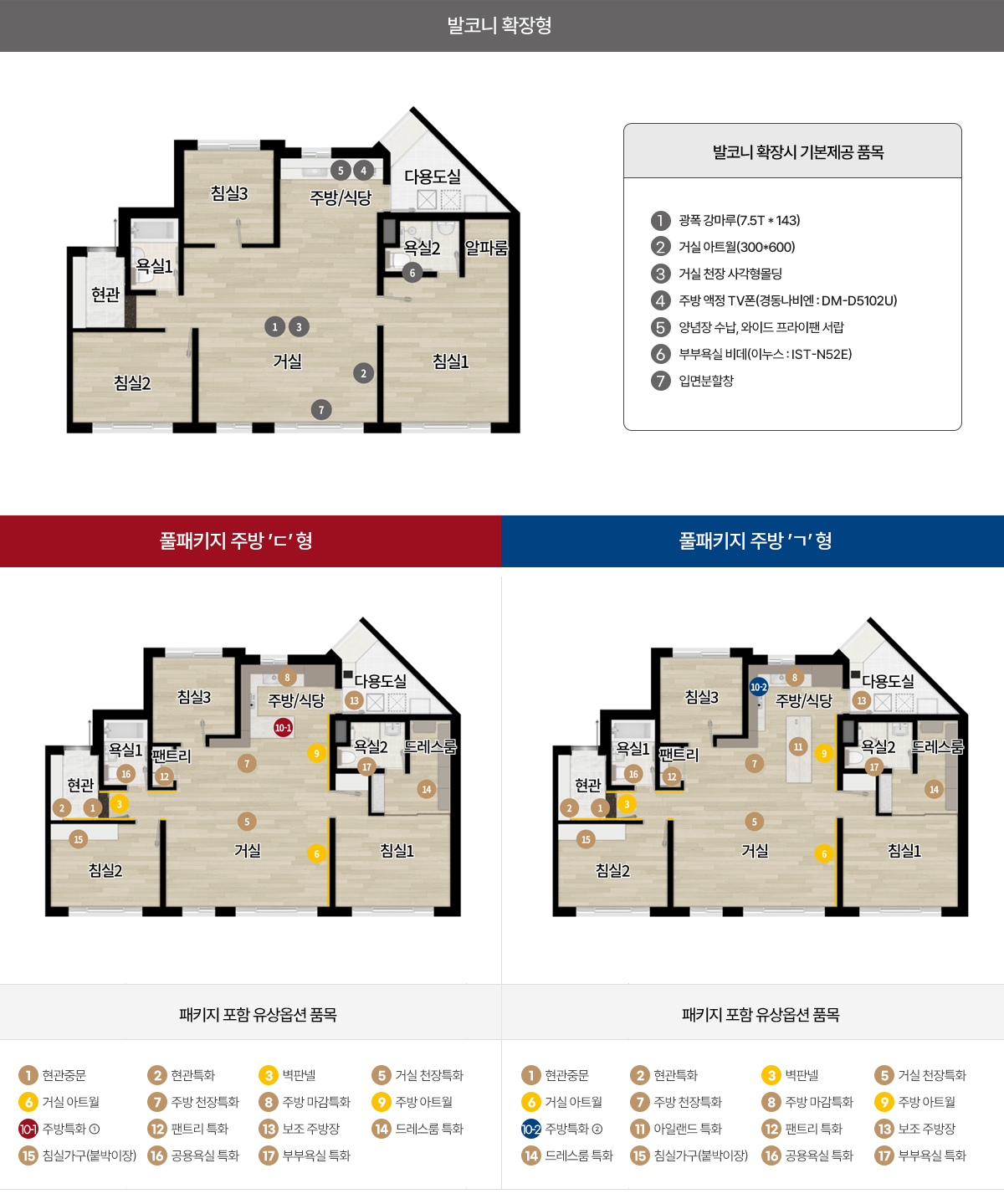 | 10-2 | 주방특화 ② | 냉장고장 + ‘ㄱ’자주방 + 상부여닫이장 + 도어마감특화(유리) + 하부장 도어마감특화(프레임도어) + 장식장(폭 약 300mm) + 무선충전기 |
